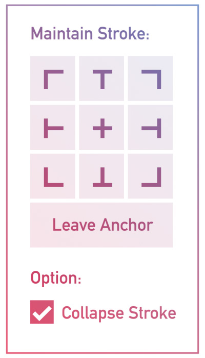 Shapes resize relative to the shape layer’s anchor point giving you the flexibility of repositioning or animating the anchor point at any time. "Leave Anchor" will maintain stroke widths and rounded corners without repositioning the anchor point.